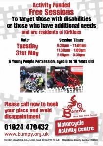 Bumpy are running motorcycle and off-road driving sessions for young people with additional needs aged 8 – 19yrs. Three sessions are running on Tuesday 31st May 2016. To book a place please telephone 01924 470432 or visit www.bumpy.org.uk.