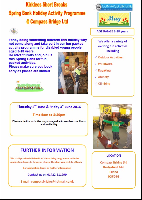 Compass Bridge are holding short breaks for young people with additional needs aged 8 – 18yrs, at their venue in Elland. Activities include woodwork, kayaking , archery and climbing. Please click on the relevant image below for more details. To book a place please print off and complete an application form.