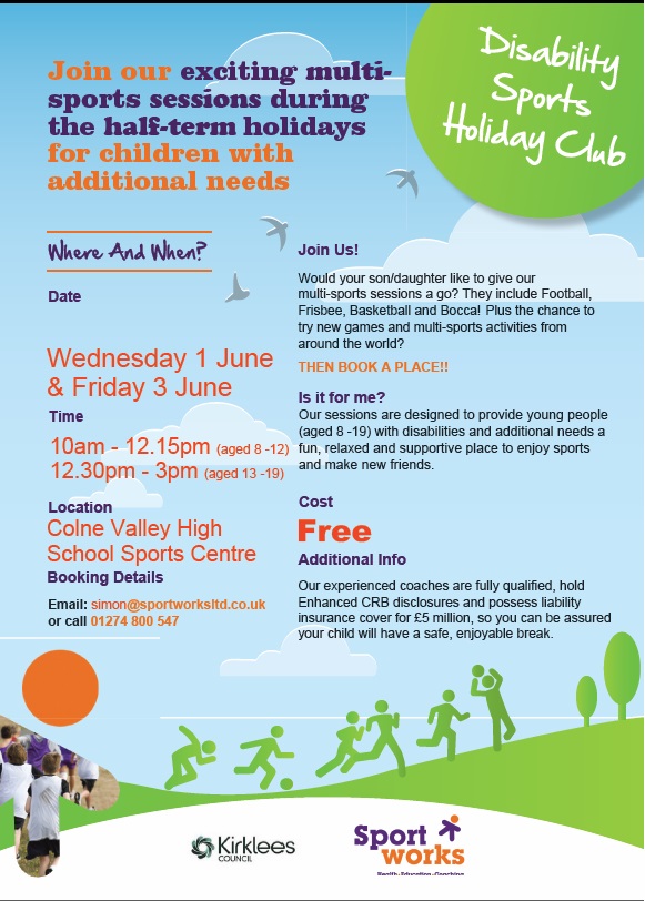 Sport Works are running multi-sports sessions for young people on Wednesday 1st and Friday 3rd June 2016 at Colne Valley High School. The morning sessions are for children aged 8 – 12yrs and the afternoon sessions for young people aged 13 – 19yrs. For more details please Email: simon@sportworksltd.co.uk or call 01274 800 547.