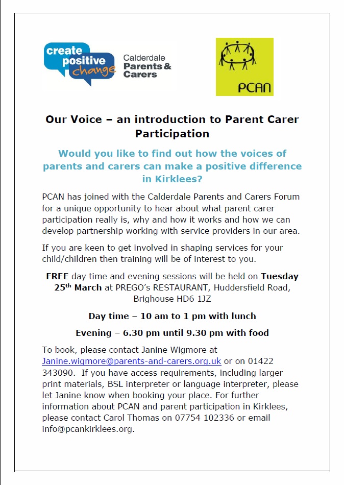 PCAN has joined up with the Calderdale Parents and Carers Forum to hold two sessions to inform you about parent carer participation.